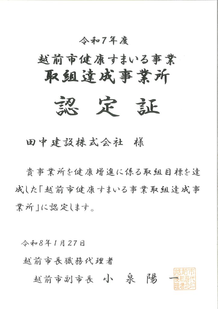 昨年度から引き続き令和7年度も、越前市から健康増進に係る取組目標を達成した「越前市健康すまいる事業取組達成事業所」に認定されました。